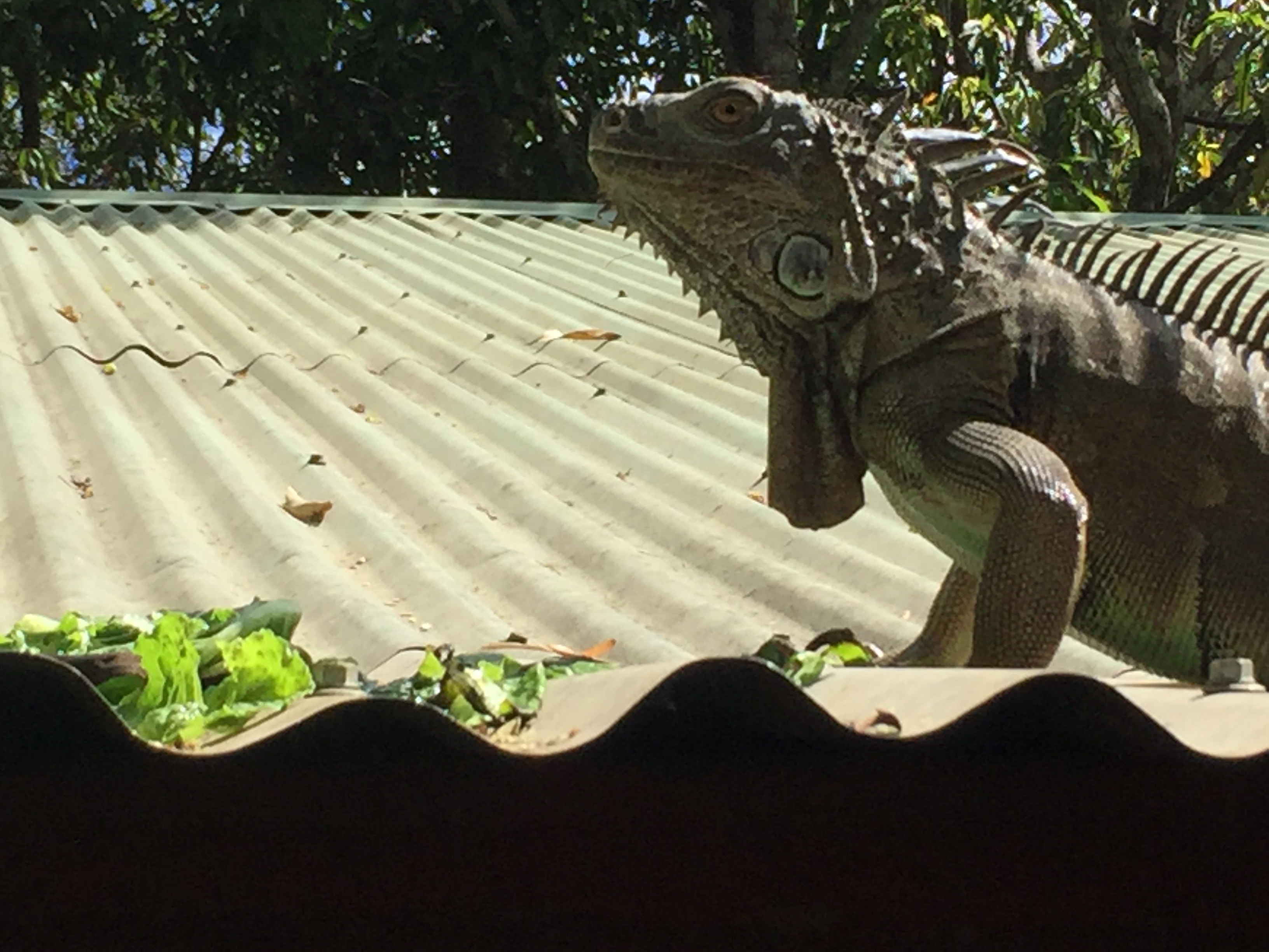 Very large iguana who stomps on our tiny kitchen roof for food, usually lettuce and bananas. Any fruit that is not suitable for our monkeys